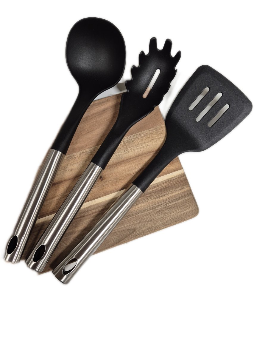 Stekspade med hål, utrustad med ett brett blad och rundade/fasade kanter som passar för att enkelt lyfta och vända bland annat kött, fisk eller grönsaker. Underlättar att försiktigt vända maten utan att riskera att den går sönder och hålen i bladet gör att olja och andra vätskor kan silas bort.