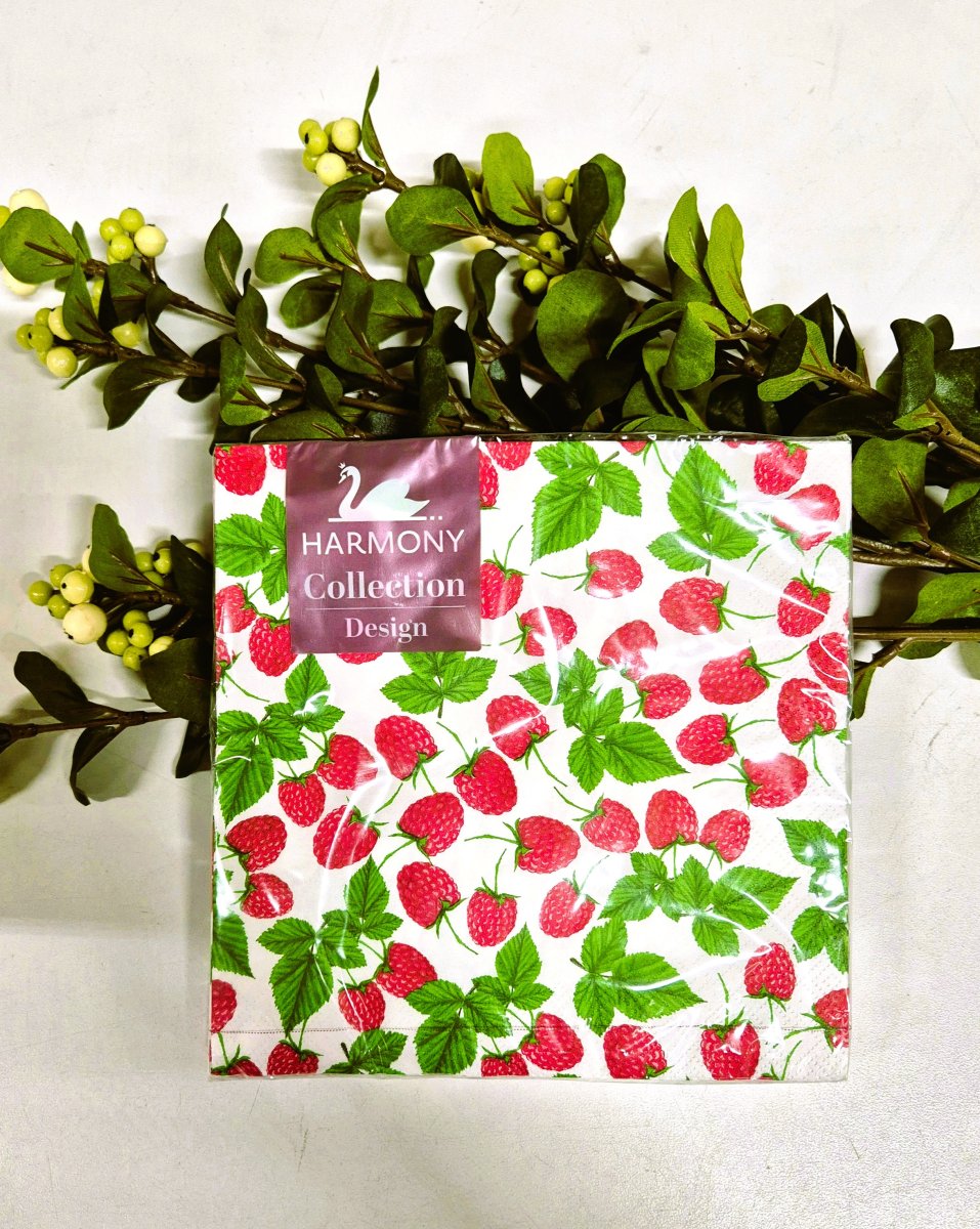 Duka fint servetter med designen hallon. Ett packet innehåller 20 servetter, en servett är tre lager.
