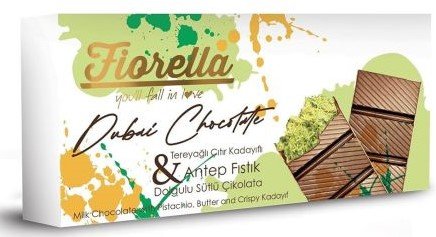 Ingredienser : Socker, PISTAGE (14%), kakaosmör, skumMJÖLKspulver, kadayif (VETE) (10%), kakaomassa, helMJÖLKspulver, vegetabilisktfett (palm), laktos (MJÖLK), smör (MJÖLK ), emuleningsmedel ( sooloslecitin, SOJAlecitin), färgämne (kopperkomplex av klorofyll och klorofyllin, birbimin), arom INNEHÅLLER MJÖLK, PISTAGENÖTTER VETE, SOJA. Kan innehålla spår av trädnötter (MANDEL, HASSELNÖTTER, KOKOSNÖTTER (enbart FDA))