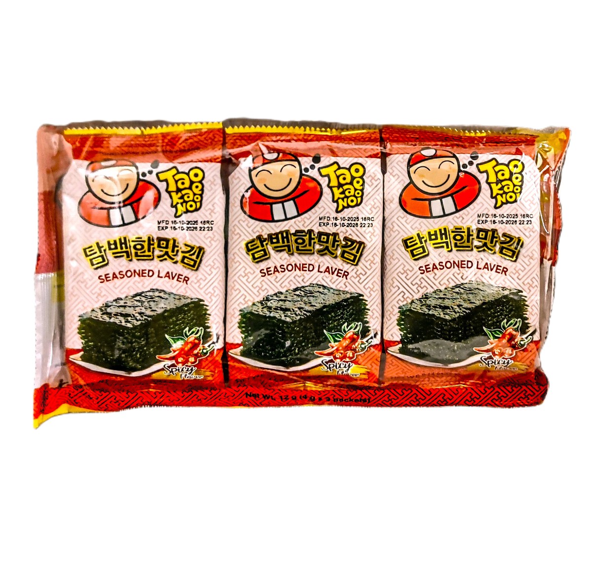 Ingredienser:Sjögräs (Pyropia spp., Sydkorea odlad) 60%, riskliolja (ohärda)(rosmarin exrakt), kryddor (socker, SOJAPROTEIN, flingor (chili, sjögräs), rök arom, smakförstärkare E621, E635, salt, nori arom (innehåller JORDNÖTTER).